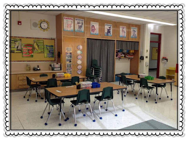 Here's the door to my room. (Blurry picture... not sure why...) I have to warn you now - all the wood in my room is old and covered with scotch tape marks, etc.... every year I think about actually fixing it up, but I never do. It's just easier to cover it :-) I found this door idea on Pinterest and loved it. I actually read the statements to my kiddos as we go out the door. I really think it helps build a sense of community and belonging, and I refer to the door during the day. That way the kids see they're not just words.